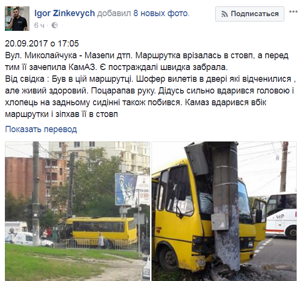 Во Львове маршрутка влетела в столб после столкновения с грузовиком