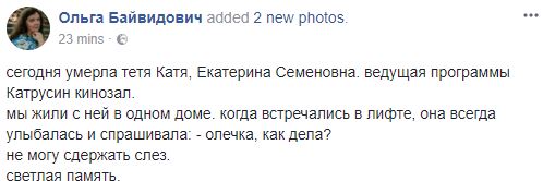 "Мы жили с ней в одном доме. Когда встречались в лифте, она всегда улыбалась и спрашивала: - Олечка, как дела?", - написала журналистка, не уточнив обстоятельства и место смерти ведущей.