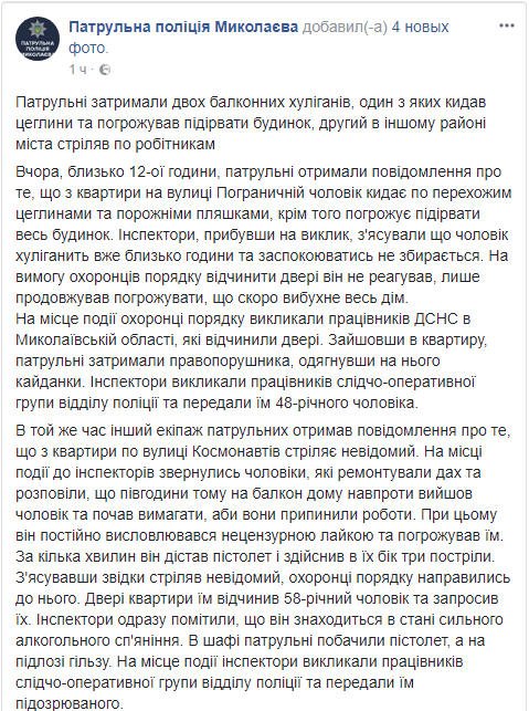 В Николаеве на улице Космонавтов вчера, 20 сентября, мужчина открыл стрельбу из окна своей квартиры. Об этом сообщает пресс-служба патрульной полиции.