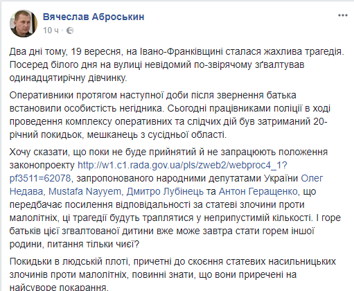 В Ивано-Франковской области, 19 сентября, посреди белого дня на улице 20-летний парень "зверски" изнасиловал 11-летнюю девочку. Об этом сообщил в Facebook первый замглавы Нацполиции Вячеслав Аброськин.