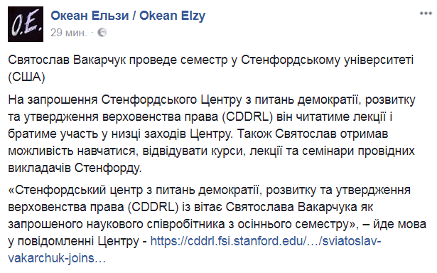 "По приглашению Стэнфордского Центра по вопросам демократии, развития и утверждения верховенства права (CDDRL) он (Святослав Вакарчук - прим.) будет читать лекции и принимать участие в ряде мероприятий Центра. Также Святослав получил возможность учиться, посещать курсы, лекции и семинары ведущих преподавателей Стенфорда", - указано в опубликованном сообщении, на страничке его музыкальной группы в соцсети.
