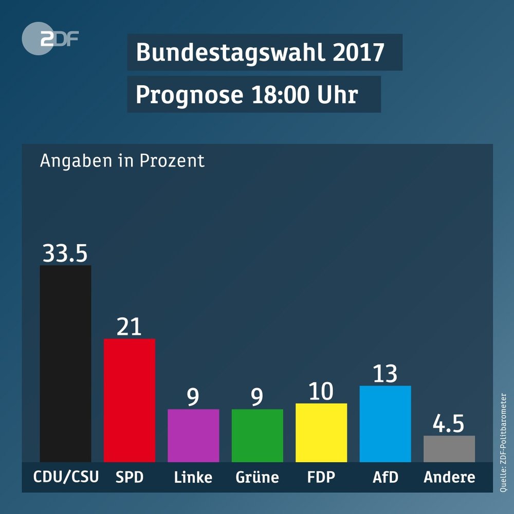 Согласно его данным, лидирующую позицию в настоящий момент удерживает правящий блок ХДС/ХСС, которому удалось получить 33,5% голосов. Второе место заняла Социал-демократическая партия Германии (СДПГ). За нее проголосовали 21% жителей ФРГ.
