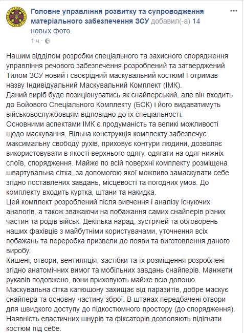 Опубликованы фото нового маскировочного костюма для украинских снайперов