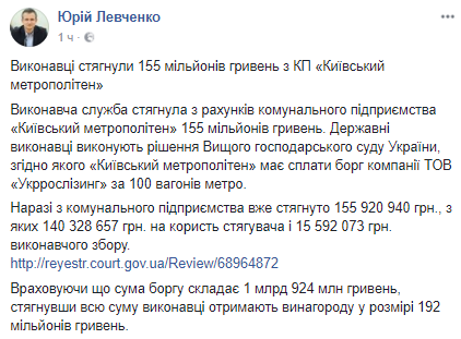 Исполнительная служба взыскала со счетов коммунального предприятия "Киевский метрополитен" 155 миллионов гривен. Об этом на своей странице в Facebook сообщил народный депутат Юрий Левченко (внефракционный).