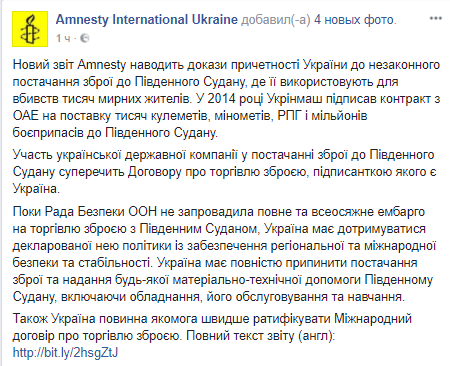 Организация Amnesty International сообщила о причастности Украины к незаконным поставкам оружия в Южный Судан. Об этом говорится в докладе международной правозащитной организации в Facebook.
