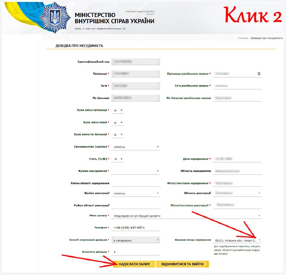 Заполняете электронную форму, указав, в каком из сервисных центров МВД (из списка) вам удобно забрать готовую справку. (Клик 2).