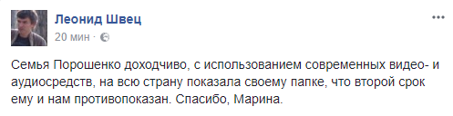 Леонид Швец журналист: "Семья Порошенко доходчиво, с использованием современных видео- и аудиосредств, на всю страну показала своему папке, что второй срок ему и нам противопоказан. Спасибо, Марина".