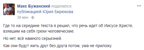 Блогер Макс Бужанский перепостил этот текст Бирюкова и прокомментировал: "Где то на середине текста я решил, что речь идет об Иисусе Христе, взявшим на себя грехи человеческие. Но нет, всё намного серьезней. Как они будут жить друг без друга потом, ума не приложу".