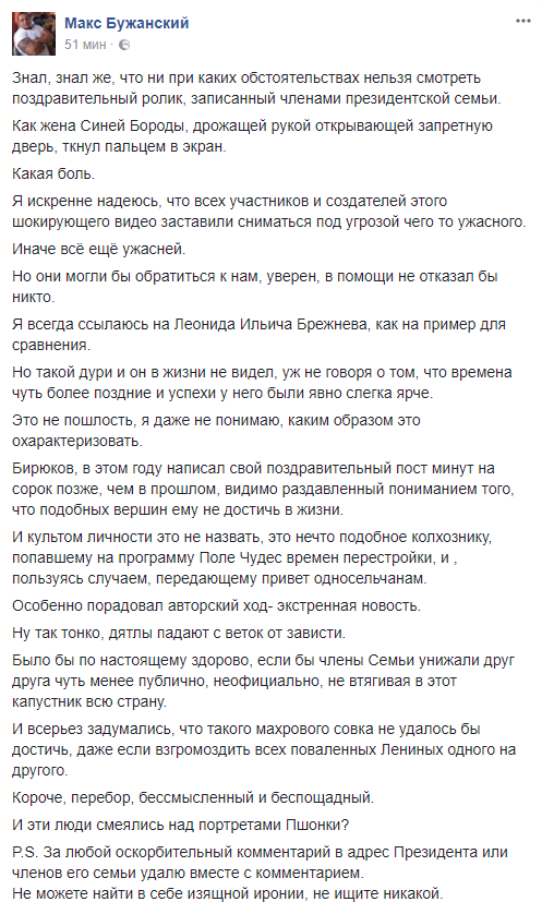 Блогер Макс Бужанский: "Знал, знал же, что ни при каких обстоятельствах нельзя смотреть поздравительный ролик, записанный членами президентской семьи. Как жена Синей Бороды, дрожащей рукой открывающей запретную дверь, ткнул пальцем в экран. Какая боль. Я искренне надеюсь, что всех участников и создателей этого шокирующего видео заставили сниматься под угрозой чего то ужасного. Иначе все еще ужасней. Но они могли бы обратиться к нам, уверен, в помощи не отказал бы никто.