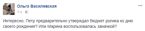 Ольга Василевская, журналист: "Интересно, Петр предварительно утверждал бюджет ролика ко дню своего рождения? Или Марина воспользовалась заначкой?"