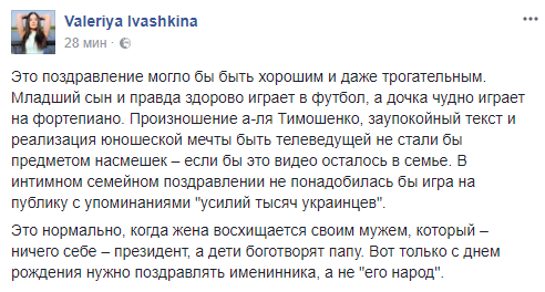 Валерия Ивашкина, журналист: "Это поздравление могло бы быть хорошим и даже трогательным. Младший сын и правда здорово играет в футбол, а дочка чудно играет на фортепиано. Произношение а-ля Тимошенко, заупокойный текст и реализация юношеской мечты быть телеведущей не стали бы предметом насмешек – если бы это видео осталось в семье. В интимном семейном поздравлении не понадобилась бы игра на публику с упоминаниями "усилий тысяч украинцев".