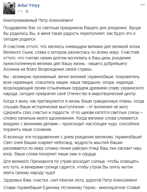 Я возношу эти поздравления с днем рождения великому Украинобаши! Свет очей Ваших озаряет небосвод, мудрость мыслей Ваших разливается по миру словно пение райских птиц! Ваш лик ласкает наш взор, Ваши слова покоряют наши умы и сердца. Для великого Президента по утрам восходит солнце, чтобы освещать его путь, и вечерами солнце садится, чтобы утром Вы опять могли явить своему народу чудо!