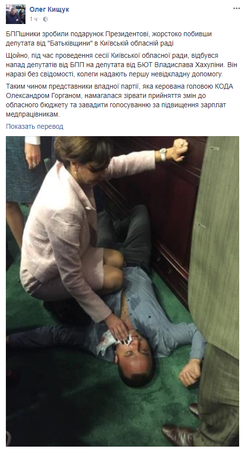 Олег Кищук, политический эксперт: "БППшники сделали подарок Президенту, жестоко избив депутата от "Батькивщины" в Киевском областном совете. Только что, во время проведения сессии Киевского областного совета, произошло нападение депутатов от БПП на депутата от БЮТ Владислава Хахулины. Он пока без сознания, коллеги оказывают первую неотложную помощь.