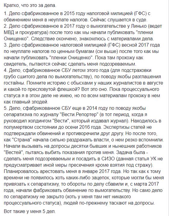 5. Дело, сфабрикованное СБУ еще в 2014 году по поводу якобы сепаратизма по журналу "Вести.Репортер" (в тот период, когда я руководил холдингом "Вести", который издавал журнал). Находилось в полумертвом состоянии до осени 2016 года. Экспертизы статей не подтверждали обвинений и противоречили друг другу. Но после того, как "Страна" начала сильно раздражать власти, о нем резко вспомнили. Начали вызывать на допросы десятки бывших и нынешних работников "Вестей", пытаясь выбить показания против меня. Задача была - сделать меня подозреваемым и посадить в СИЗО (данная статья УК не предусматривает иной меры пресечения кроме взятия под стражу). Планировалось арестовать меня в январе 2017 года. Но так как к тому времени не появилось хоть каких-либо зацепок, которые могли бы меня привязать к сепаратизму, то обороты по делу сбавили и, с марта 2017 года, начали фабриковать обвинение по вымогательству. Но само дело по сепаратизму не закрыто (хоть у меня там нет никакого процессуального статуса), людей по-прежнему таскают на допросы".