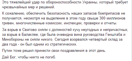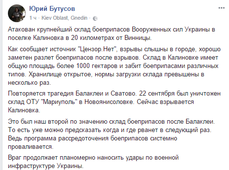 "Склад в Калиновке имеет общую площадь более 1000 гектаров и забит боеприпасами различных типов. Хранилище открытое, нормы загрузки склада превышены в несколько раз. Повторяется трагедия Балаклеи и Сватово. 22 сентября был уничтожен склад ОТУ "Мариуполь" в Новоянисоловке. Сейчас взрывается Калиновка. Это был наш второй по значению склад боеприпасов после Балаклеи. То есть уже можно предсказать когда и где рванет в следующий раз. Ведь программа рассредоточения боеприпасов системно проваливается. Враг продолжает планомерно наносить удары по военной инфраструктуре Украины. Эта катастрофа лишает нас огромных запасов боеприпасов. Рассредоточить боеприпасы не удалось несмотря на неоднократные нападения противника. Дозвониться сейчас на арсенал не получается. Это тяжелейший удар по обороноспособности Украины, который требует чрезвычайных мер и решений", -написал он.