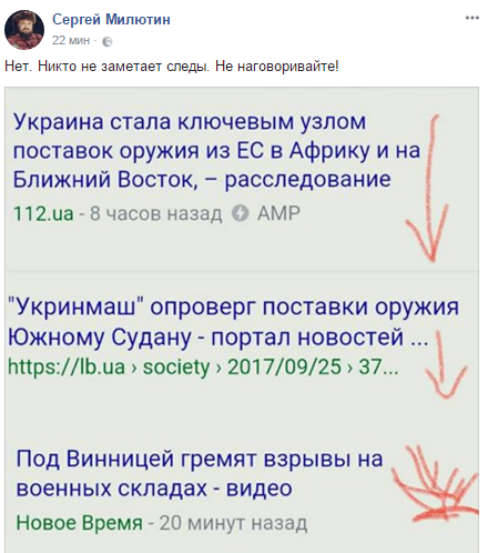 Другой пользователь соцсетей Серегй Милютин обратил внимание, что взрывы последовали почти сразу после громких скандалов по поводу поставок оружия из Украины в Африку и на Ближний Восток.