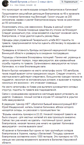 О возможности совершения диверсии на территории области именно в этот день было известно Службе безопасности, и власть сделала масштабный поиск диверсантов. Этот день - день рождения президента Петра Порошенко, и диверсия в его родной Винницкой области не может быть совпадением. Поэтому никаких сомнений в том, что 48 арсенал уничтожен противником у меня нет", - написал Бутусов в Facebook.