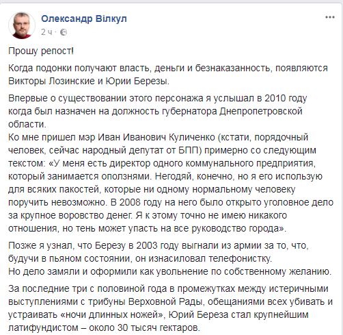 "Скажите, чем Береза отличатся от еще одного скандально известного бывшего нардепа Виктора Лозинского? Первое, оба – латифундисты, феодалы.  Второе. Лозинский убил человека, посмевшего зайти на его охотничьи угодья. Береза – привез к себе домой человека и вымогал переписать на него арендованные земельные паи. Когда тот не согласился, пытал с 2 до 6 часов утра, сломав четыре позвонка, ребра, нанеся тяжкие травмы головы. Сейчас человек в реанимации. Вероятность выживания – 20%, как говорят врачи", - пишет Вилкул.