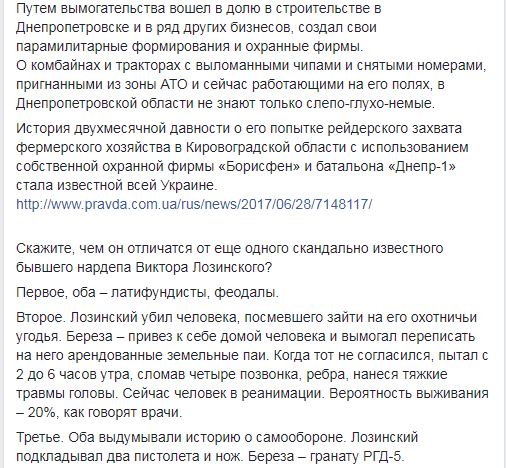 И добавляет: "За последние три с половиной года в промежутках между истеричными выступлениями с трибуны Верховной Рады, обещаниями всех убивать и устраивать "ночи длинных ножей", Юрий Береза стал крупнейшим латифундистом – около 30 тысяч гектаров. Путем вымогательства вошел в долю в строительстве в Днепропетровске и в ряд других бизнесов, создал свои парамилитарные формирования и охранные фирмы. О комбайнах и тракторах с выломанными чипами и снятыми номерами, пригнанными из зоны АТО и сейчас работающими на его полях, в Днепропетровской области не знают только слепо-глухо-немые".