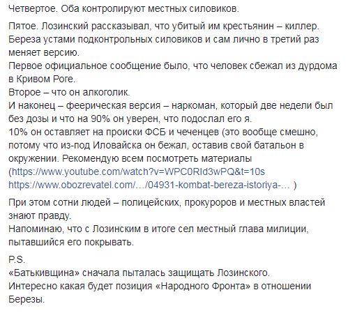 Он также отмечает, что "оба выдумывали историю о самообороне. Лозинский подкладывал два пистолета и нож. Береза – гранату РГД-5". "Четвертое. Оба контролируют местных силовиков. Пятое. Лозинский рассказывал, что убитый им крестьянин – киллер. Береза устами подконтрольных силовиков и сам лично в третий раз меняет версию. Первое официальное сообщение было, что человек сбежал из дурдома в Кривом Роге. Второе – что он алкоголик.