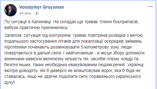 "По ситуации в Калиновке. На складах еще продолжается тление боеприпасов, взрывы практически прекратились", - сообщил Гройсман.
