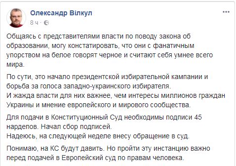 Также он отметил, что "общаясь с представителями власти по поводу закона об образовании, могу констатировать, что они с фанатичным упорством на белое говорят черное и считают себя умнее всего мира". "По сути, это начало президентской избирательной кампании и борьба за голоса западно-украинского избирателя. И жажда власти для них важнее, чем интересы миллионов граждан Украины и мнение европейского и мирового сообщества", - считает нардеп.