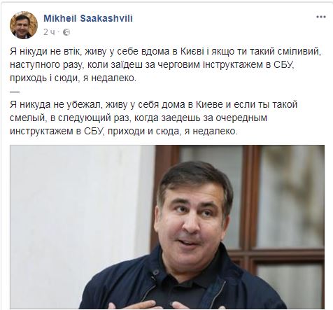 "Я никуда не убежал, живу у себя дома в Киеве и если ты такой смелый, в следующий раз, когда заедешь за очередным инструктажем в СБУ, приходи и сюда, я недалеко", - написал Саакашвили.