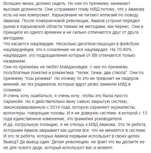 "Среди лидеров мнений, журналистов и волонтеров есть масса людей, которые выливают тонны дерьма на ВСУ, но никогда ни одним словом не критикуют МВД. В то время, когда каждая закупка в ВСУ разбирается общественностью под микроскопом, все торги в МВД закрыты. И всех устраивают и рюкзаки по 3 тыс грн и форма нацгвардии 2701 и ботинки тысяча шагов. За каждый наградной ствол от МО поднимается буря, но сотни стволов розданных Аваковым проходят незаметно. И эти люди, они, конечно же, не придворные. Они называют себя объективными и независимыми. Правда какая то странная объективность получается.