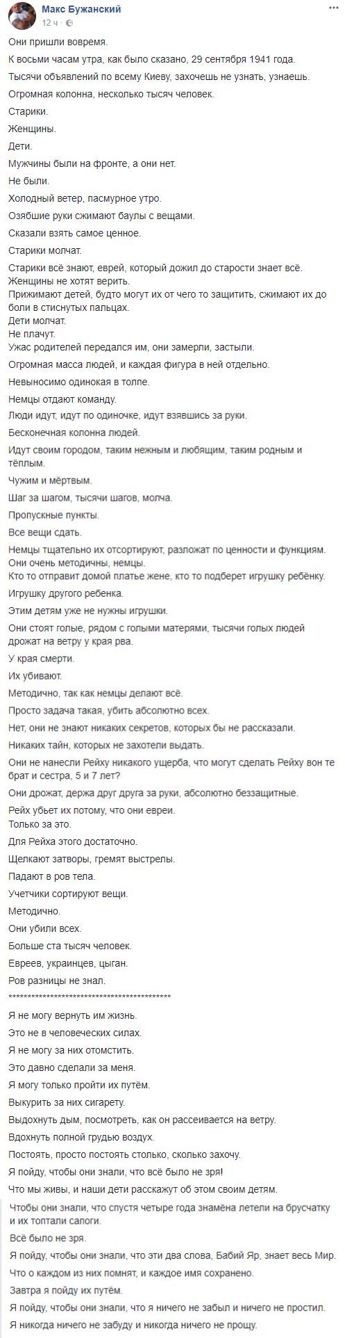 Елена Скачко, журналист: "Каждый год в этот день я пишу одни и те же слова. Во мне нет ни капли еврейской крови. В анамнезе моей семьи не выбита болью дата 29 сентября. Но каждый год в этот день я искренне скорблю со всем адекватным миром. Потому что нет ничего страшнее, чем оголтелый, охреневший, неистовый фашизм. Бабий Яр. Сегодня. Не важно, в каком году. Бабий Яр - это навсегда".