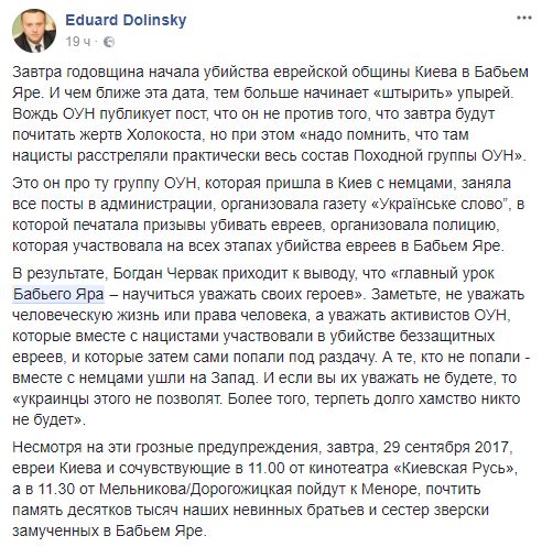 Эдуард Долинский, глава Украинского еврейского комитета: "Завтра годовщина начала убийства еврейской общины Киева в Бабьем Яре. И чем ближе эта дата, тем больше начинает "штырить" упырей. Вождь ОУН публикует пост, что он не против того, что завтра будут почитать жертв Холокоста, но при этом "надо помнить, что там нацисты расстреляли практически весь состав Походной группы ОУН".