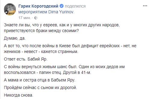Гарик Корогодский, бизнесмен: "Знаете ли вы, что у евреев, как и у многих других народов, приветствуются браки между своими? Думаю, да. А вот то, что после войны в Киеве был дефицит еврейских - нет, не женихов - невест - кажется странным. Ответ есть. Бабий Яр.