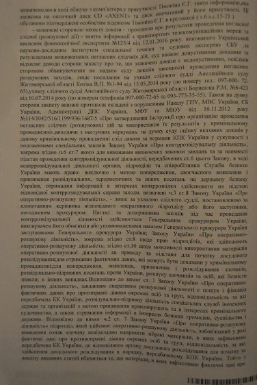Она упоямнула, что телефоны Васильца и Тимонина прослушивали в июне - августе 2014 года. Аудиозаписи, расшифровки приобщили к делу как доказательства. А само уголовное дело было зарегистрировано 04 апреля 2015 года. При этом Закон "Об оперативно-розыскной деятельности" предусматривает, что прослушка возможна только по постановлению следственного судьи в рамках уголовного производства.