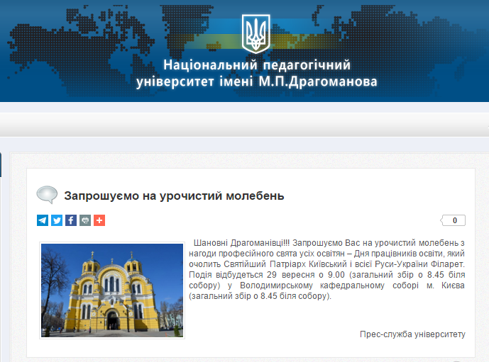 В Национальном педагогическом университете имени Драгоманова студентов отправили вместо пар на молебен во Владимирского соборе. О приглашении на молебен сообщает официальный сайт университета.