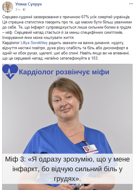 "Эта страшная статистика говорит о том, что мы должны быть более внимательными к себе.", - пишет Супрун.
