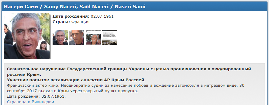 Исполнителя главной роли в фильме "Такси" внесли в черный список за "сознательное нарушение государственной границы Украины с целью проникновения в оккупированный Россией Крым. Участник попыток легализации аннексии АР Крым Россией. (…) 30 сентября 2017 въехал в Крым через закрытый пункт пропуска", - говорится в профиле Сами Насери на сайте "Миротворца".