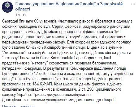 Полиция Запорожья открыла производство после сегодняшнего нападения на участников фестиваля равенства, в ходе которого пострадало два человека. Об этом правоохранители сообщают в Facebook.
