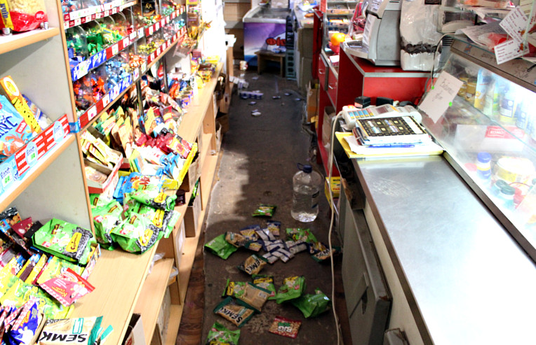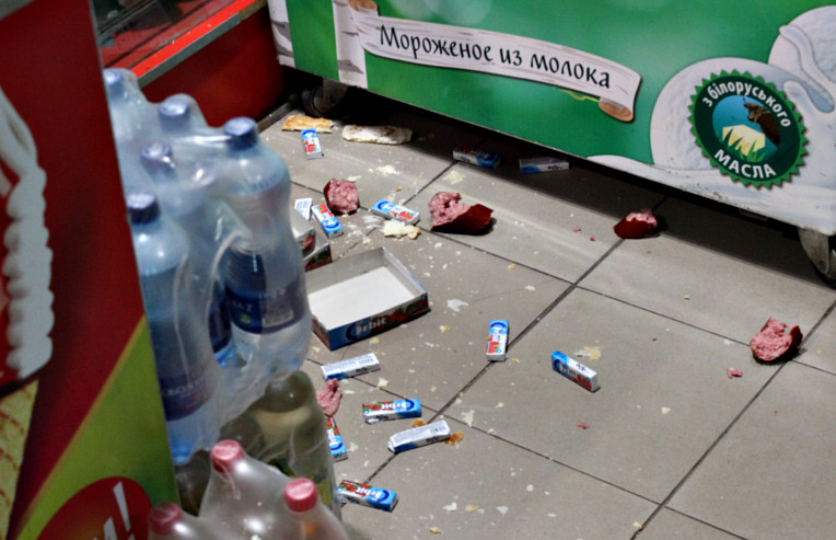 По словам владелицы магазина, два серых полосатых больших енота сидели возле прилавка утром, а вокруг по полу валялись объедки колбас, сыров, разбитые бутылки дорогостоящего спиртного, сладости.