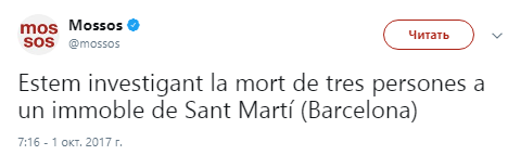 "Мы расследуем смерть трех человек в здании в Сан-Марти (Барселона)", — говорится в сообщении.