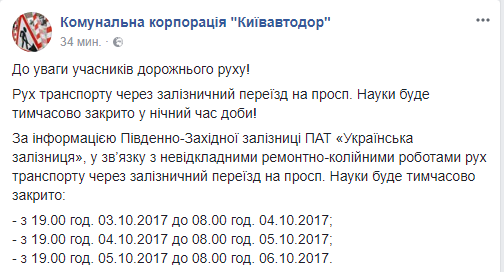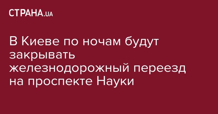 В Киеве на ночное время суток временно закроют движение транспорта через железнодорожный переезд на проспекте Науки из-за необходимости неотложного ремонта. Об этом в Facebook сообщает "Киевавтодор".