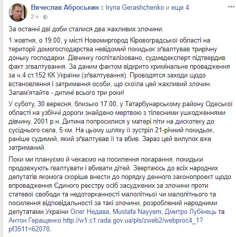 "Ребенок попросился у матери пойти на дискотеку в соседнее село, 5 км. На этом пути ее встретил 21-летний подонок, ранее судимый, который изнасиловал ее и убил. Сейчас это отродье уже задержано", - написал Аброськин