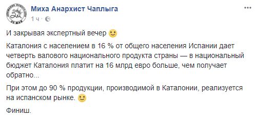 Михаил Чаплыга, политолог, блогер: "Каталония с населением в 16 % от общего населения Испании дает четверть валового национального продукта страны — в национальный бюджет Каталония платит на 16 млрд евро больше, чем получает обратно... При этом до 90 % продукции, производимой в Каталонии, реализуется на испанском рынке. Финиш".