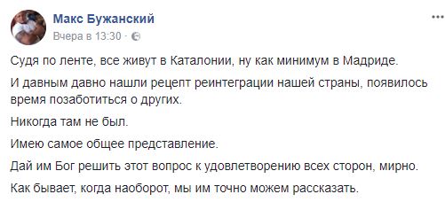 Макс Бужанский, блогер: "Судя по ленте, все живут в Каталонии, ну как минимум в Мадриде. И давным давно нашли рецепт реинтеграции нашей страны, появилось время позаботиться о других ... Дай им Бог решить этот вопрос к удовлетворению всех сторон, мирно. Как бывает, когда наоборот, мы им точно можем рассказать".
