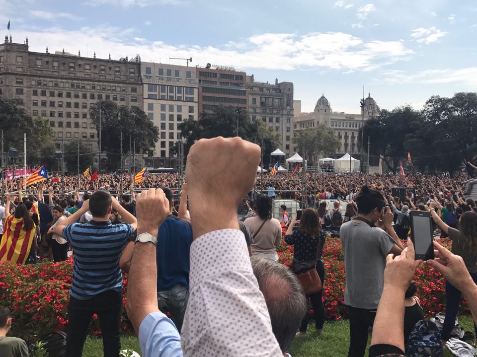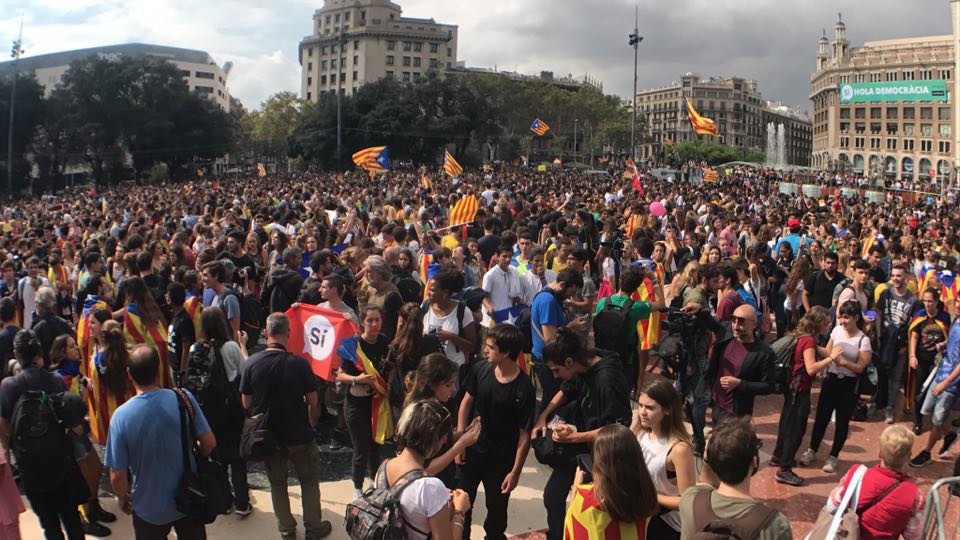 На площади Каталония в Барселоне проходит многотысячная акция протеста каталонских студентов против жесткого разгона сторонников референдума, который вчера устроила Национальная полиция и Гражданская гвардия.