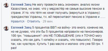 Заец ответил: "Не могу провести весь экономич. анализ жизни Казахстана, но знаю, что у медсестёр не самые высокие пенсии в стране. И то, что тётя не хочет получать (вернуться в Украину) гражданство Украины, т.к. ей пересчитают пенсию в Украине и ...5 процентов ВВП на войну - это много, конечно же, но не думаю, что эти бы 5 процентов направили на пенсионеров. 100 грн. "повышения"- это НЕ ПОВЫШЕНИЕ (это я ТОЧНО могу сказать, это как дать 1 копейку и сказать, что повысили). Говорю так, как чувствую. Купить 1 раз масло и молоко -это уже 50 грн. 1 раз!"