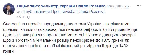 Об этом он написал на своей странице в Facebook: " Сегодня на совещании с народными депутатами Украины, с руководителями фракций, на которой обсуждалась пенсионная реформа, было принято еще одно важное решение о том, что мы готовы, и у нас есть для этого ресурс, чтобы с 1 октября минимальный размер пенсии вырос не до 1373 гривны, как планировалось ранее, а чтобы минимальный размер пенсии вырос до 1452 гривны".