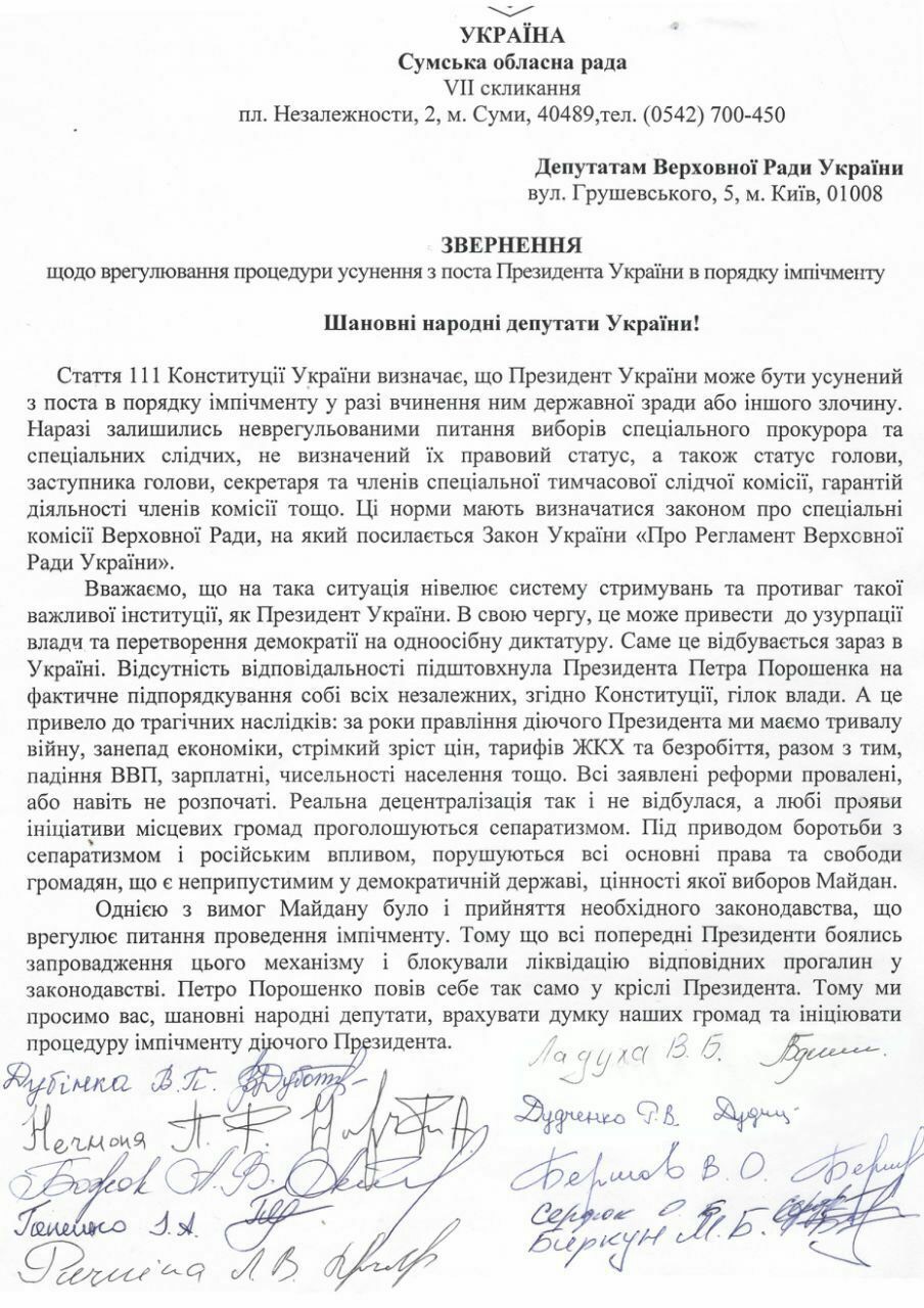 Депутаты Сумского областного совета подписали обращение к Верховной Раде с призывом инициировать импичмент президента Украины Петра Порошенко. Об этом сообщает "Голос.UA".