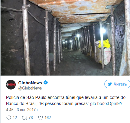 На строительство туннеля бразильцы потратили около миллиона долларов. В полиции отмечают, что это ограбление могло стать самым крупным в истории страны.