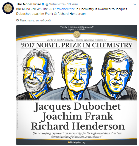 В среду, 4 октября, шведская королевская академия наук объявила лауреатов Нобелевской премии по химии 2017 года. Об этом говорится в Twitter научной премии.