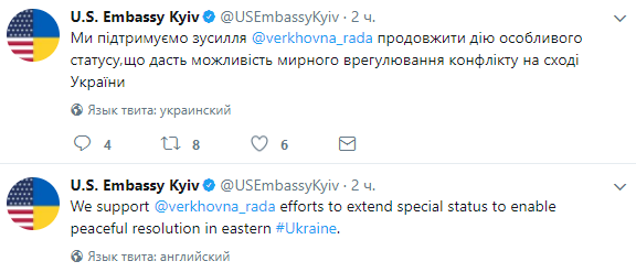 Соединенные Штаты Америки "поддерживают усилия Верховной Рады Украины", направленные на продление действия закона "Об особом порядке местного самоуправления в отдельных районах Донецкой и Луганской областей". Об этом говорится в сообщении посольства в Twitter.