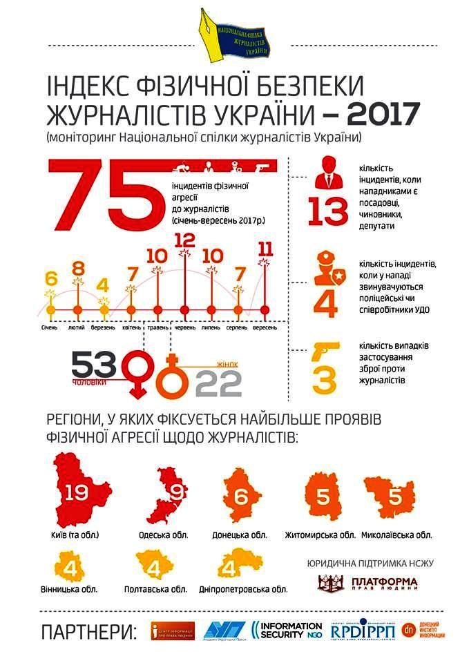 Согласно фактам, обнародованным НСЖУ, наиболее часто препятствуют работе представителей СМИ чиновники и депутаты разных уровней. За 9 минувших месяцев зафиксировано 13 таких случаев. В 4 фактах нападения на них репортеры обвиняют представителей силовых структур. В криминальных ситуациях против журналистов было применено оружие.